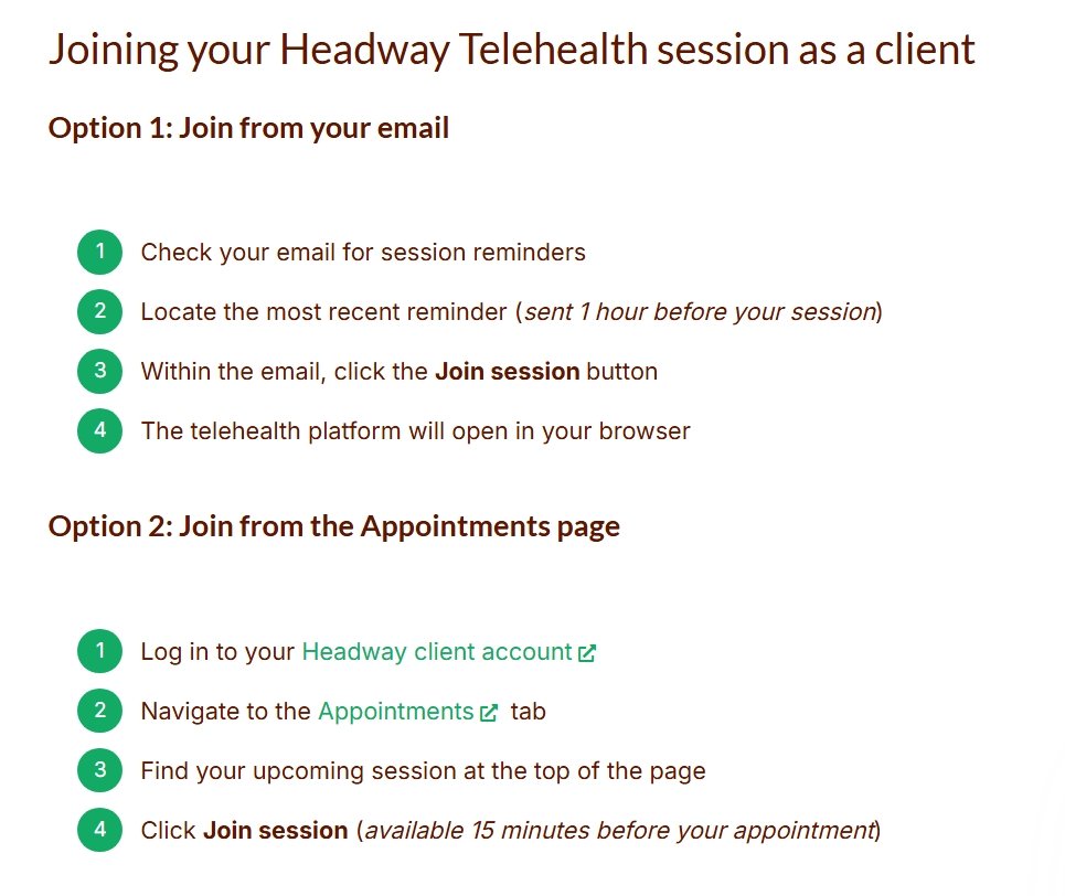 I am using the HIPAA-compliant video component of Headway for telehealth sessions. You do not need to download an app to join your session. You simply click the video link in your reminder email that is sent 1 hour prior to our appointment, and a new browser window will open with the video.